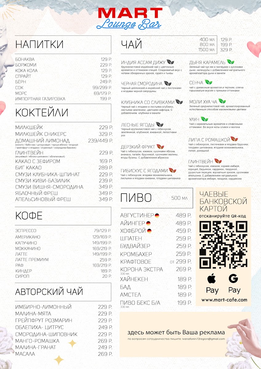 Whether you’re catching up with friends or seeking a cozy spot to unwind, MART Lounge Bar stands out as a place where every visit feels memorable. The inviting ambiance makes it ideal for both casual meals and special gatherings. Don’t miss out on this culinary gem in Ishim!